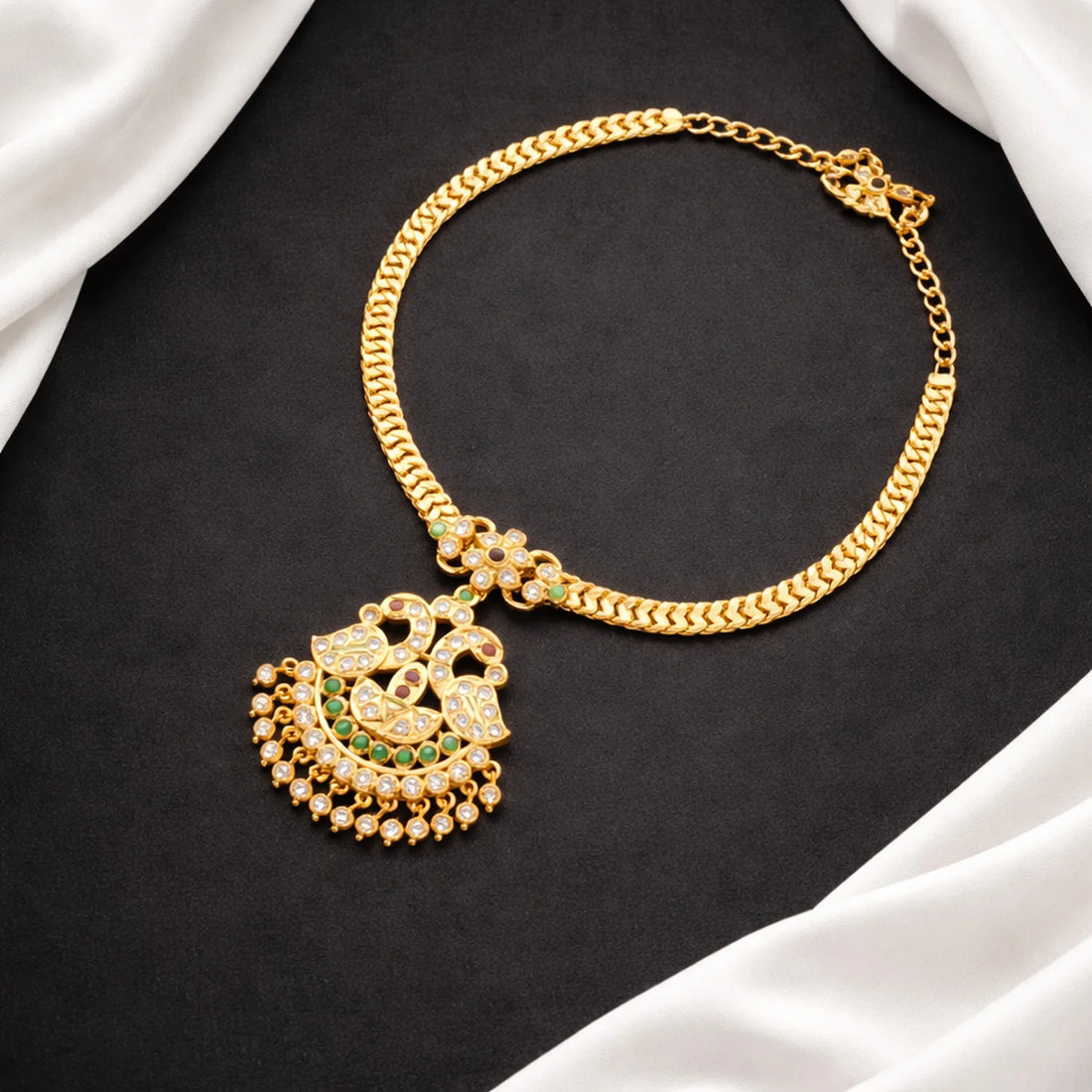 Make a bold and regal statement with this exquisite Lakshmi peacock temple jewellery set, crafted...