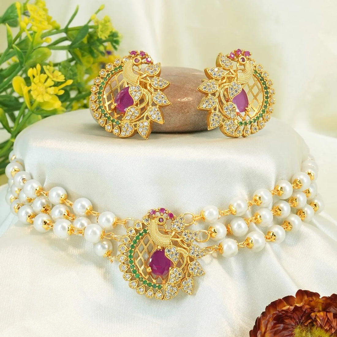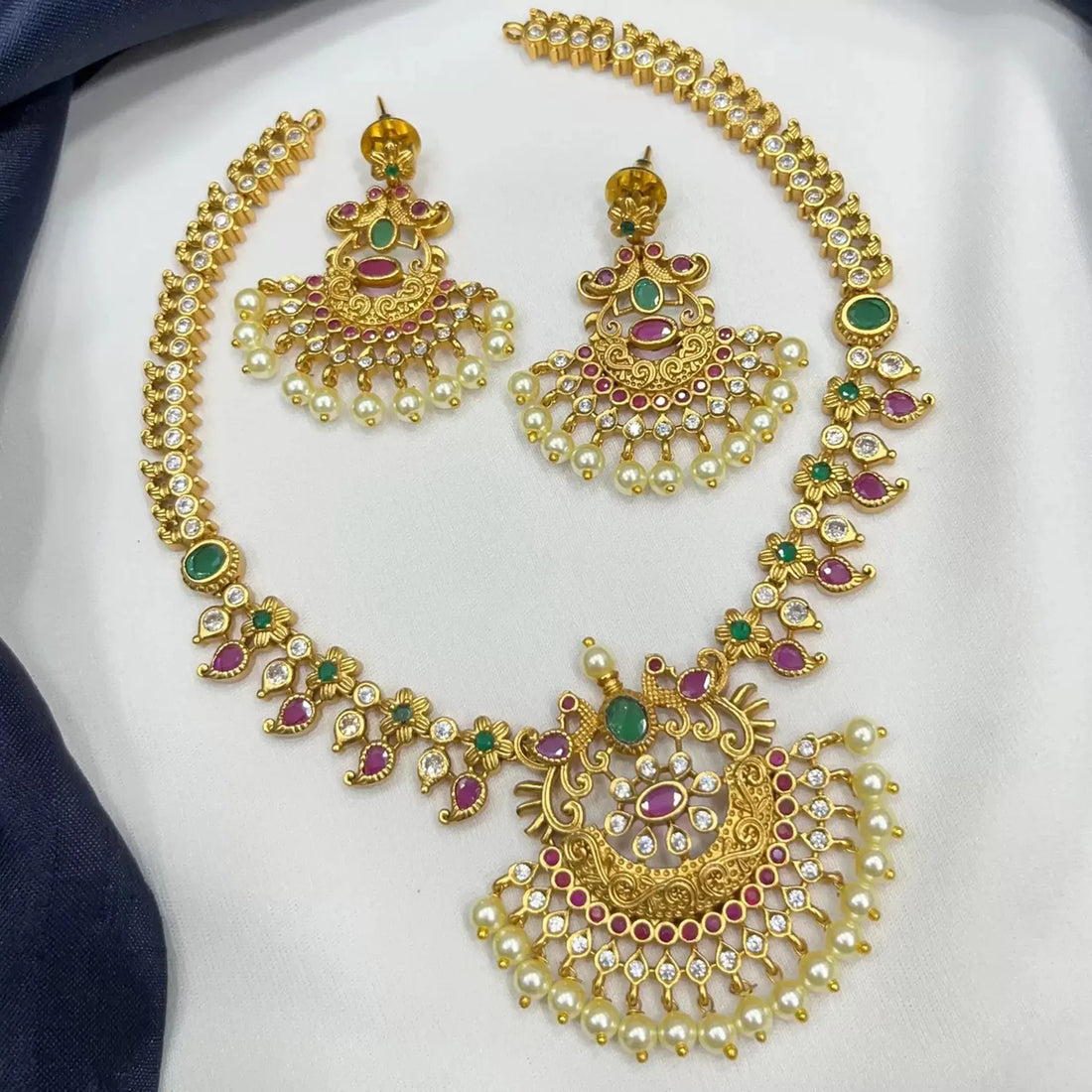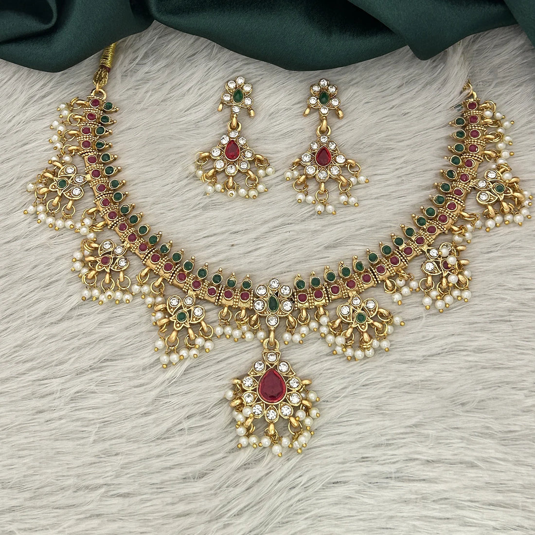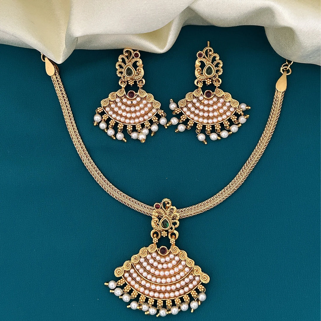 Matte Gold AD Temple Choker Set with Pearl Drops