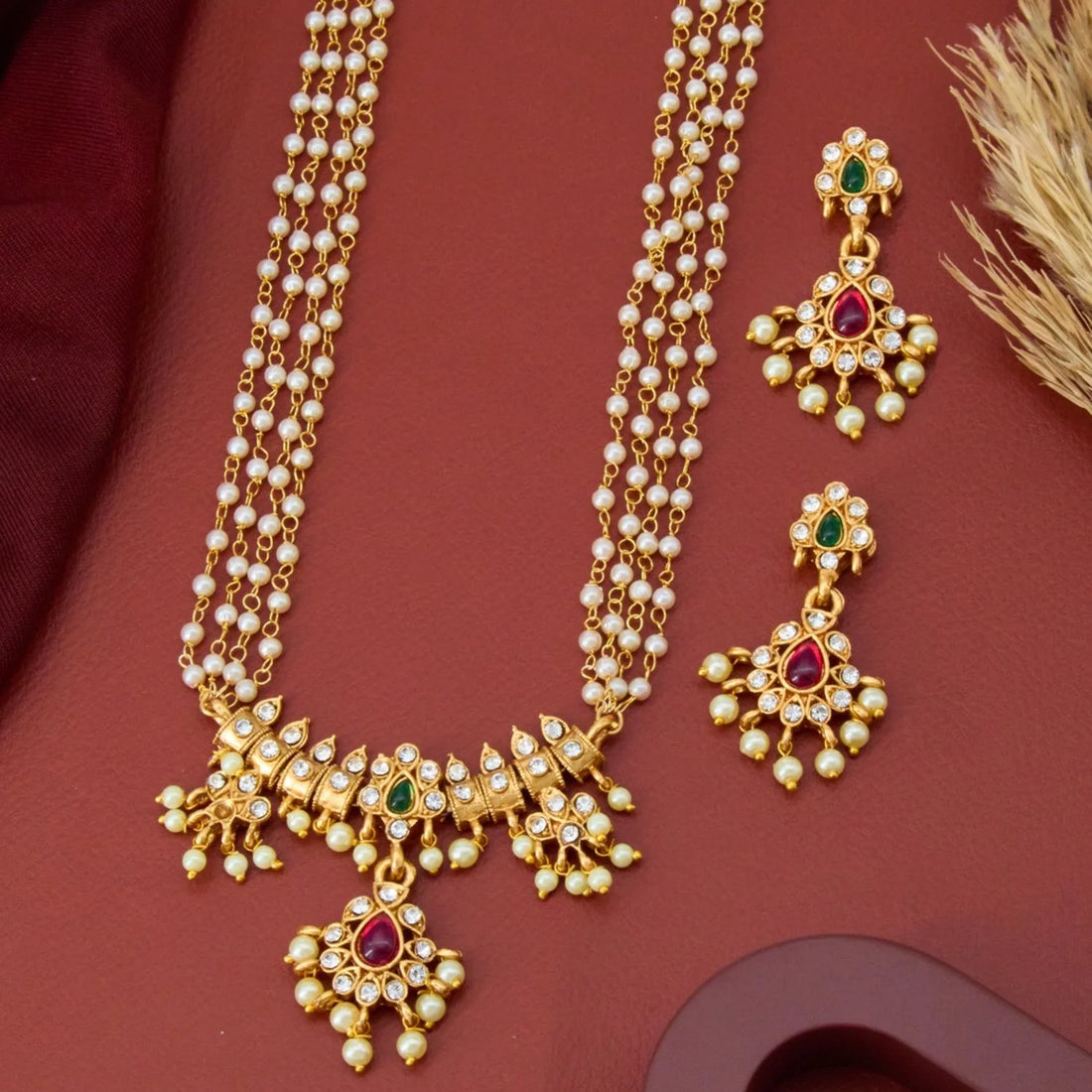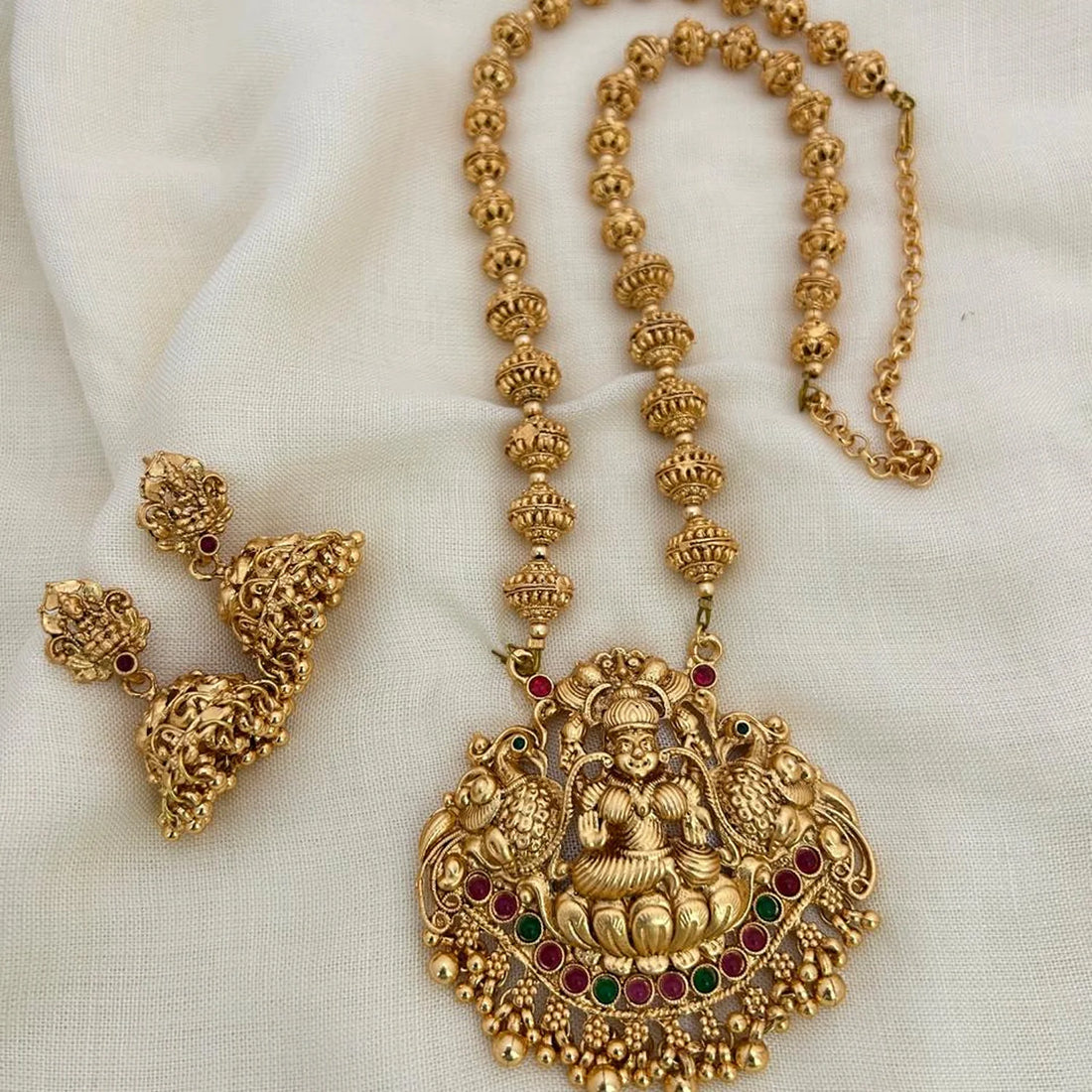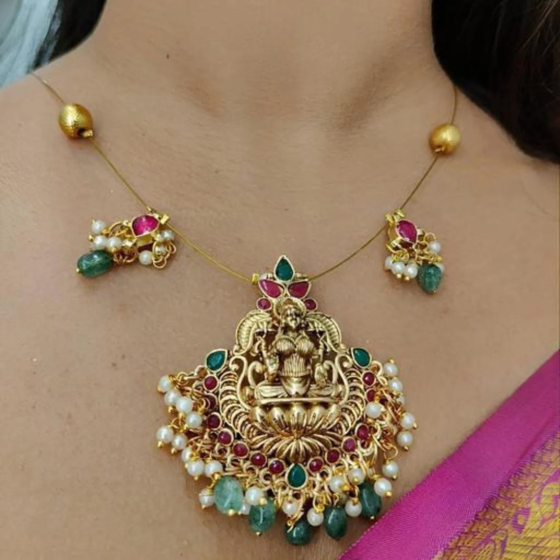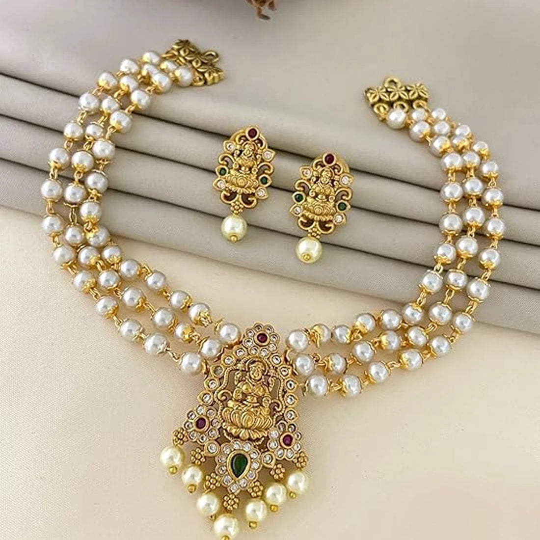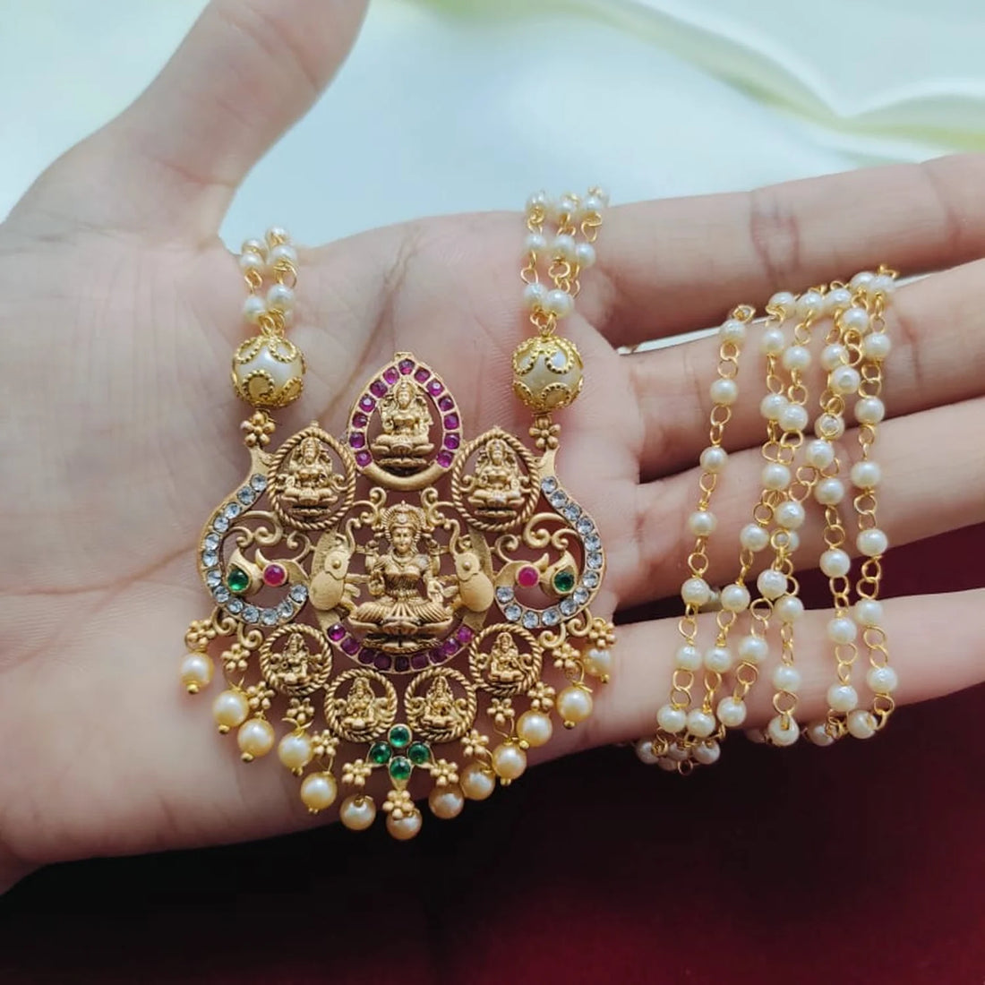 Lakshmi Temple Mala Gold Plated Pendant Set with Pearls