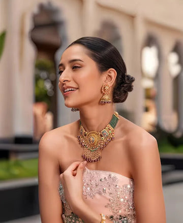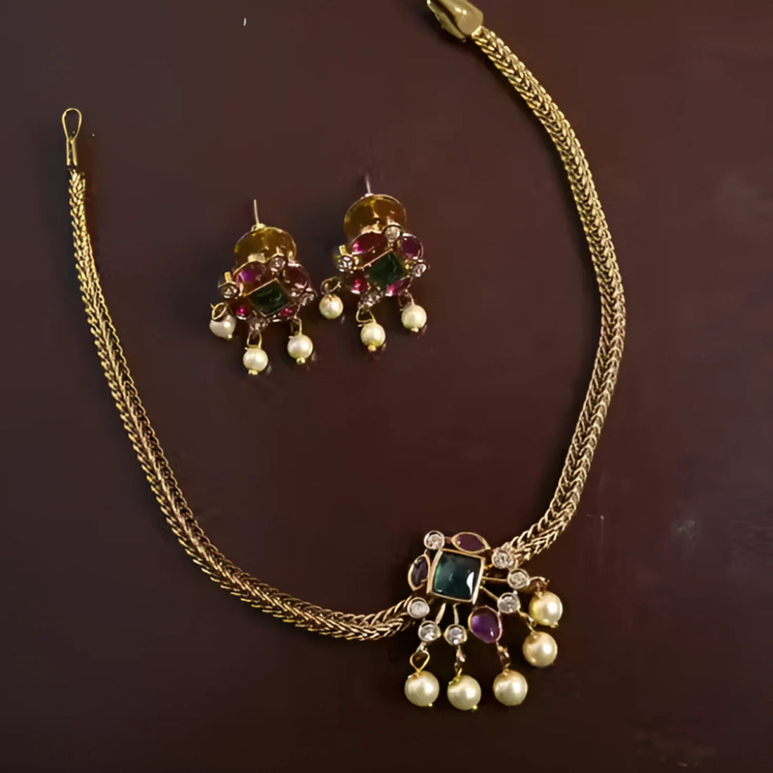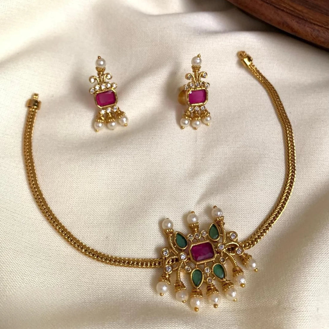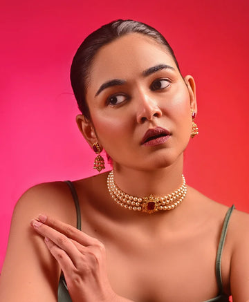 Step into elegance with this beautifully crafted temple-style pearl choker set, designed to give you...