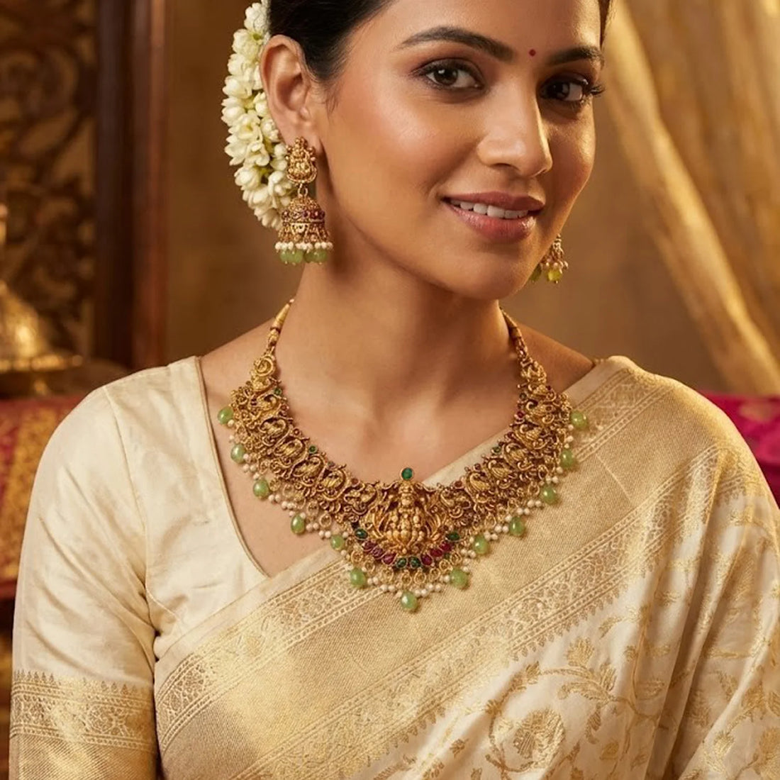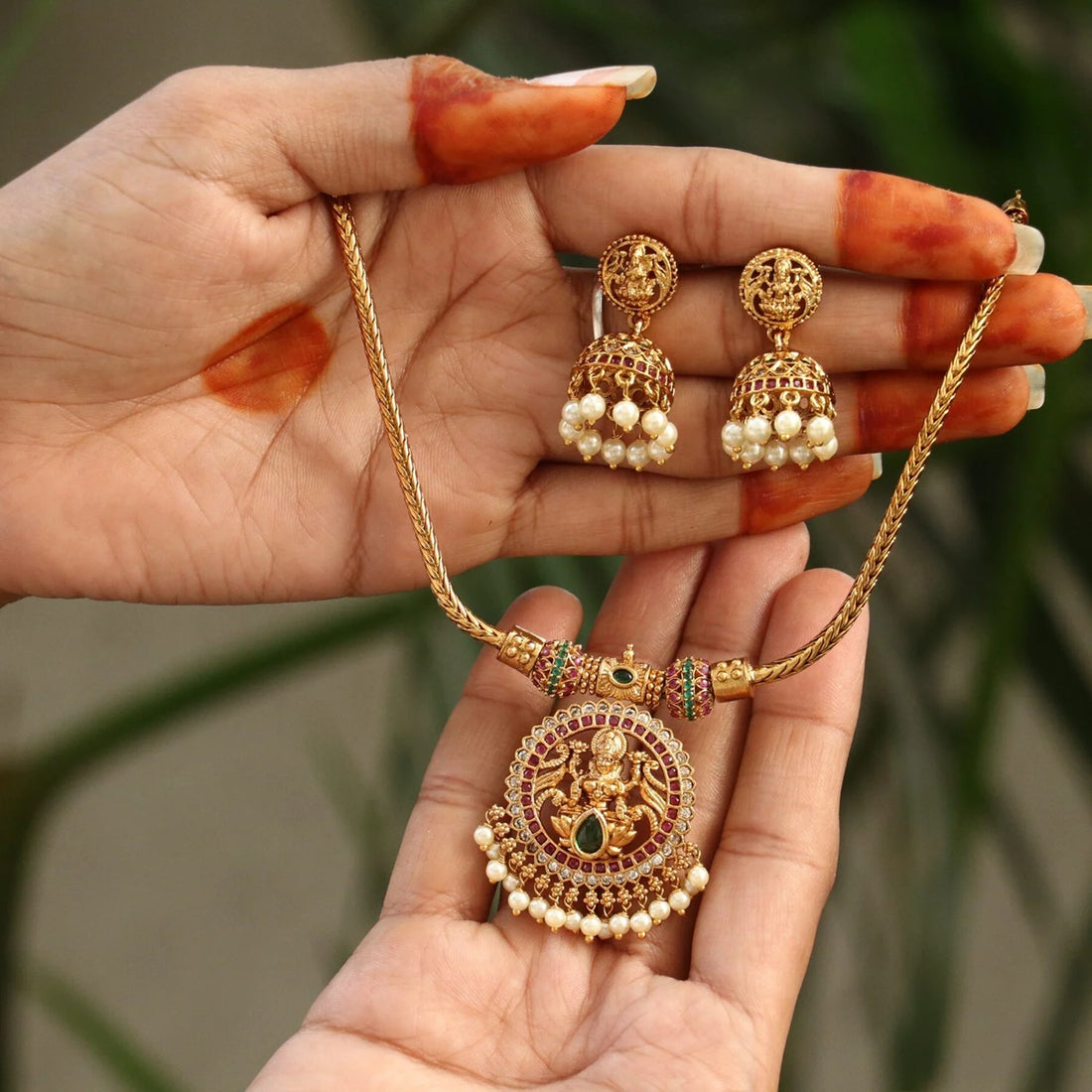 Make a royal statement with this stunning Lakshmi temple pendant set, crafted with intricate detailing...
