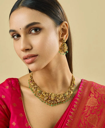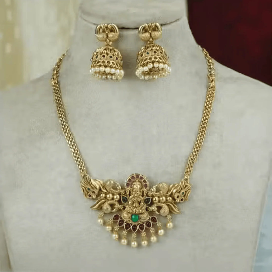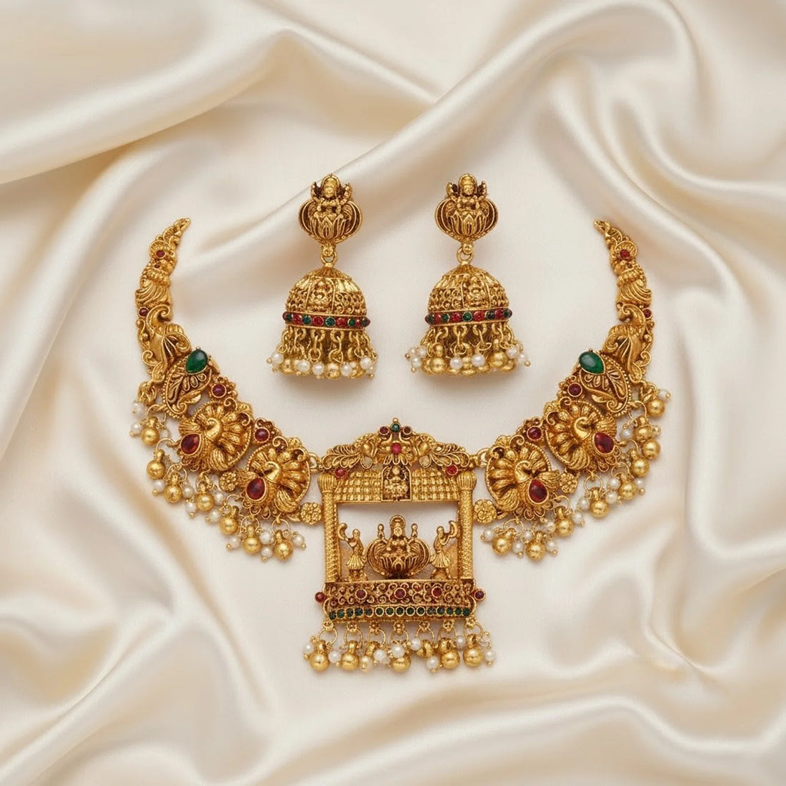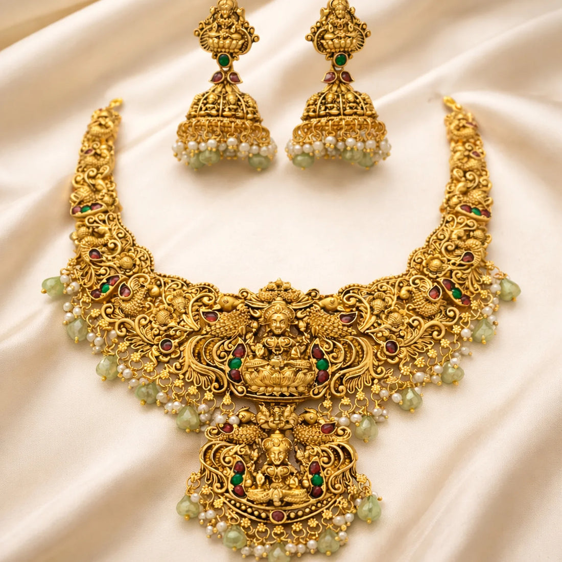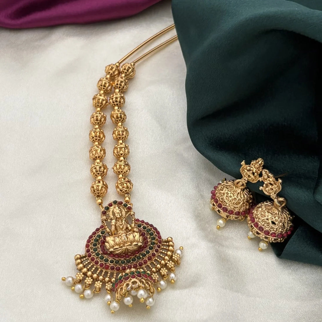 Lakshmi Antique Gold Temple Necklace Set with Jhumka Earrings