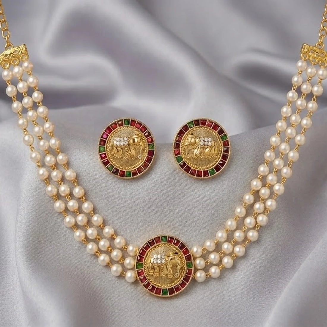 Elephant Pearl Gold Plated Choker Set with Stud Earrings