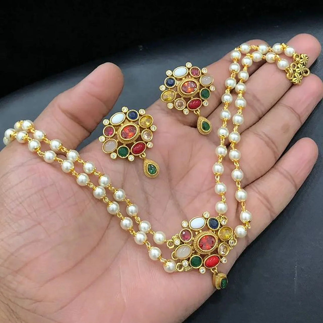 Elevate your traditional look with this stunning multicolor stone pearl mala pendant set, designed to...