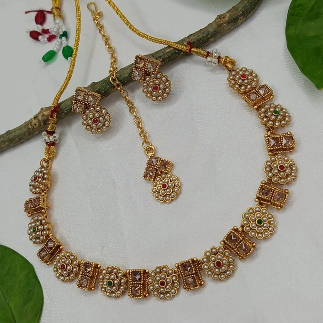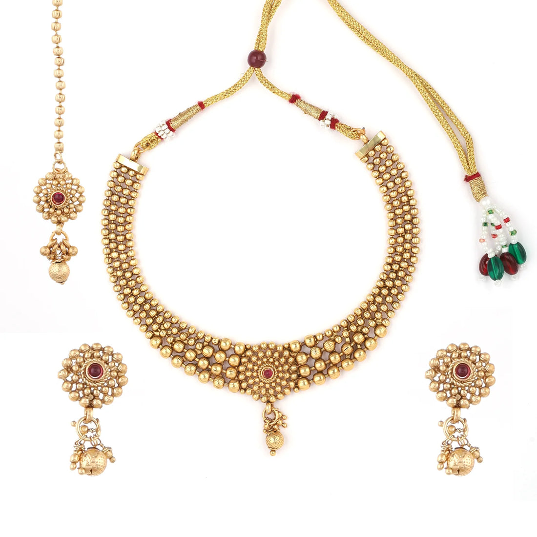 Traditional Gold Beaded Choker Set with Maang Tikka