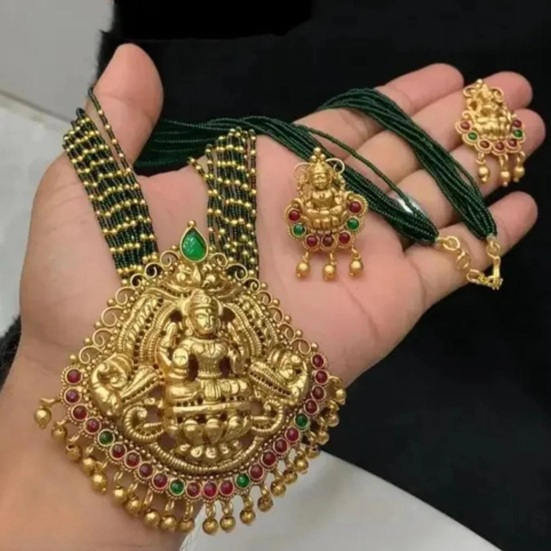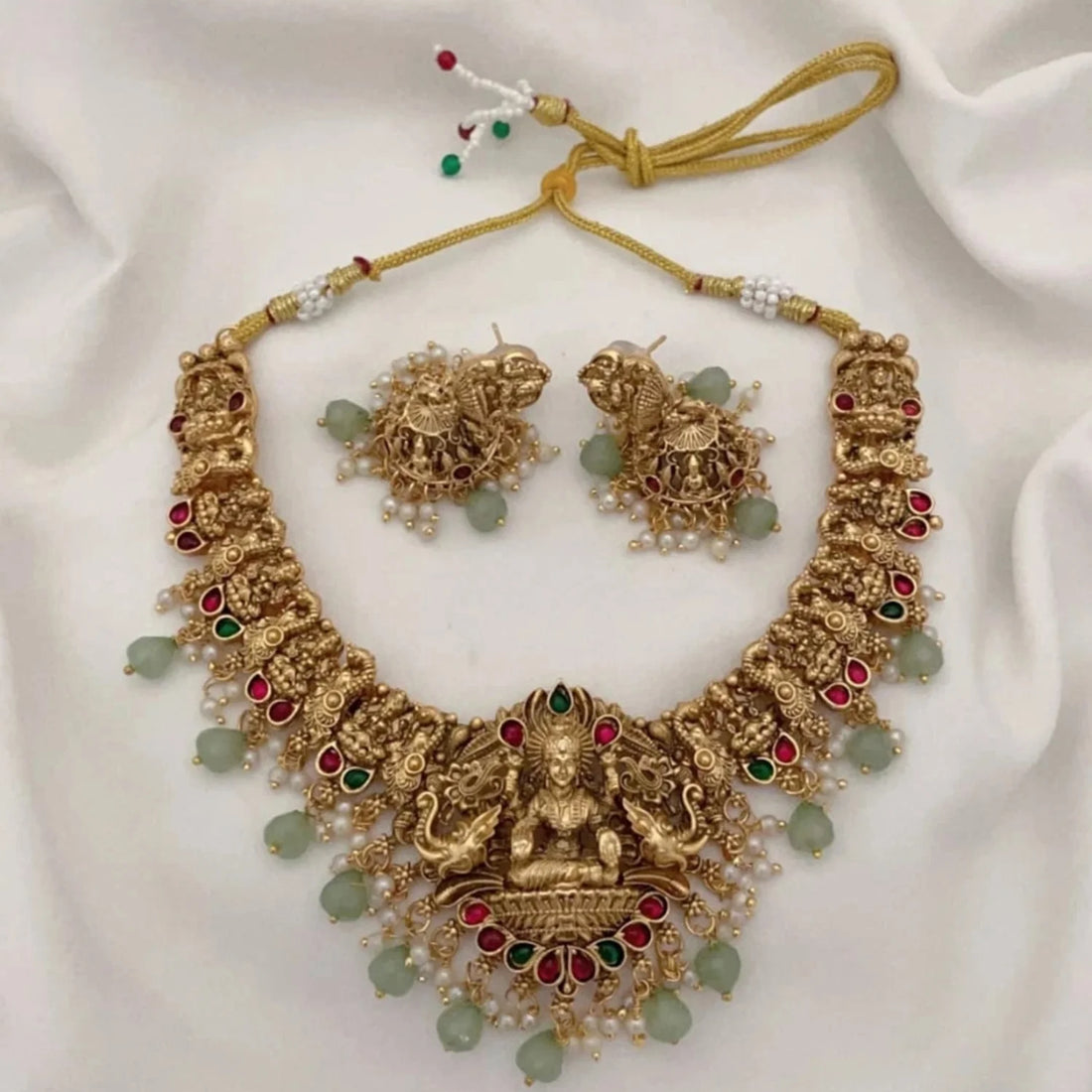 Lakshmi Temple Green Beaded Pendant Necklace Set