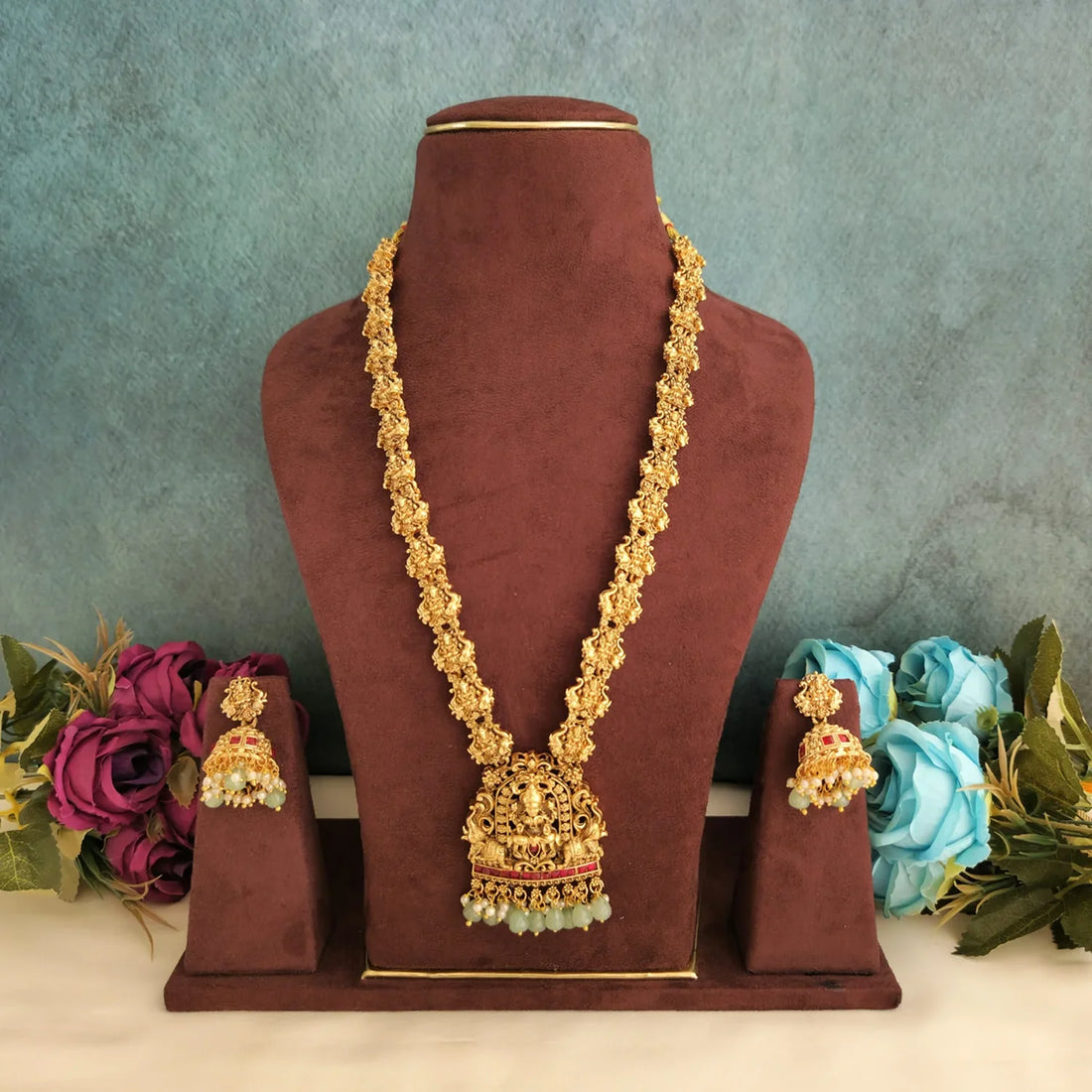 Embrace timeless tradition with this exquisite Lakshmi temple long necklace set, designed to add a...
