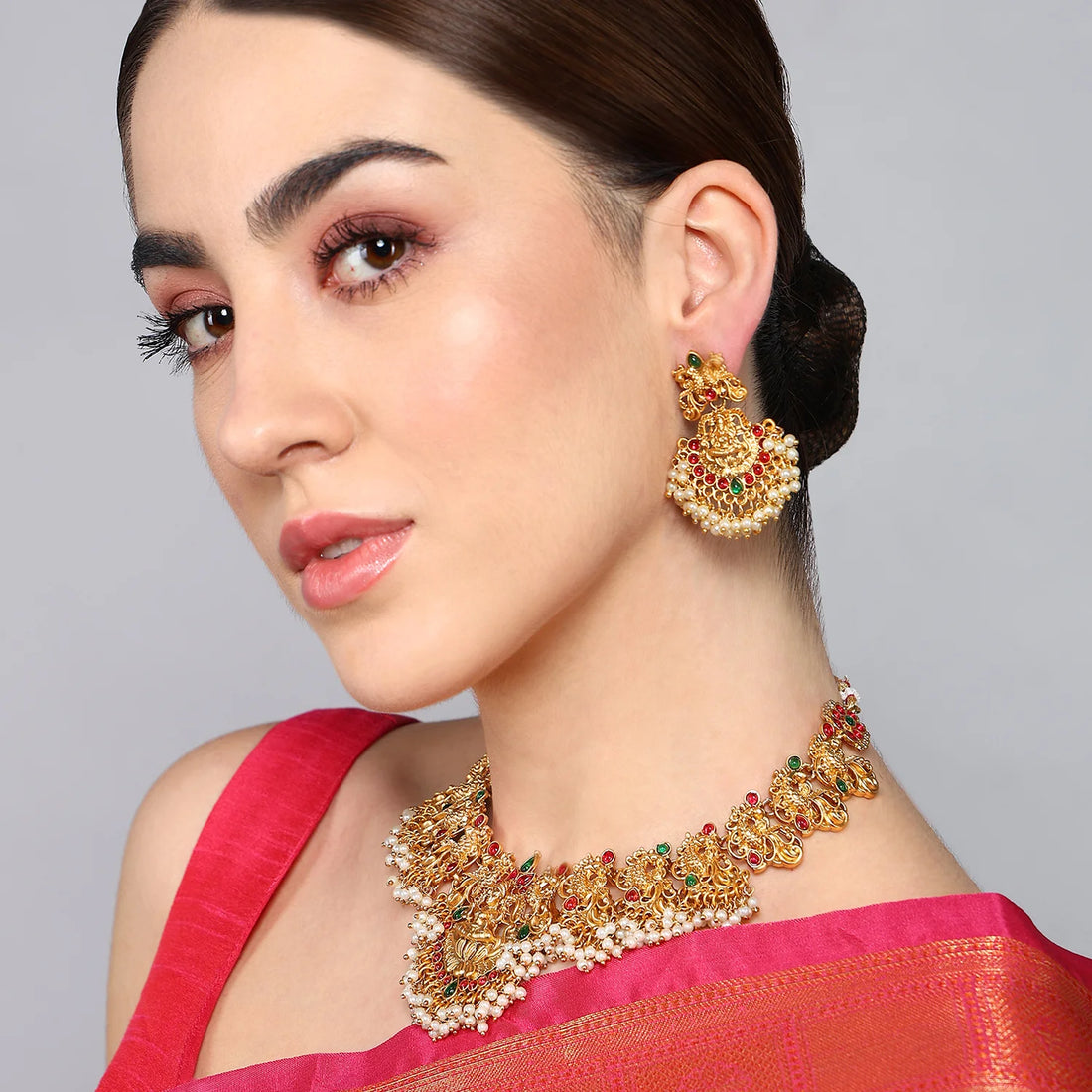 Lakshmi Temple Gold Plated Choker Set with Pearl Jhumka Earrings